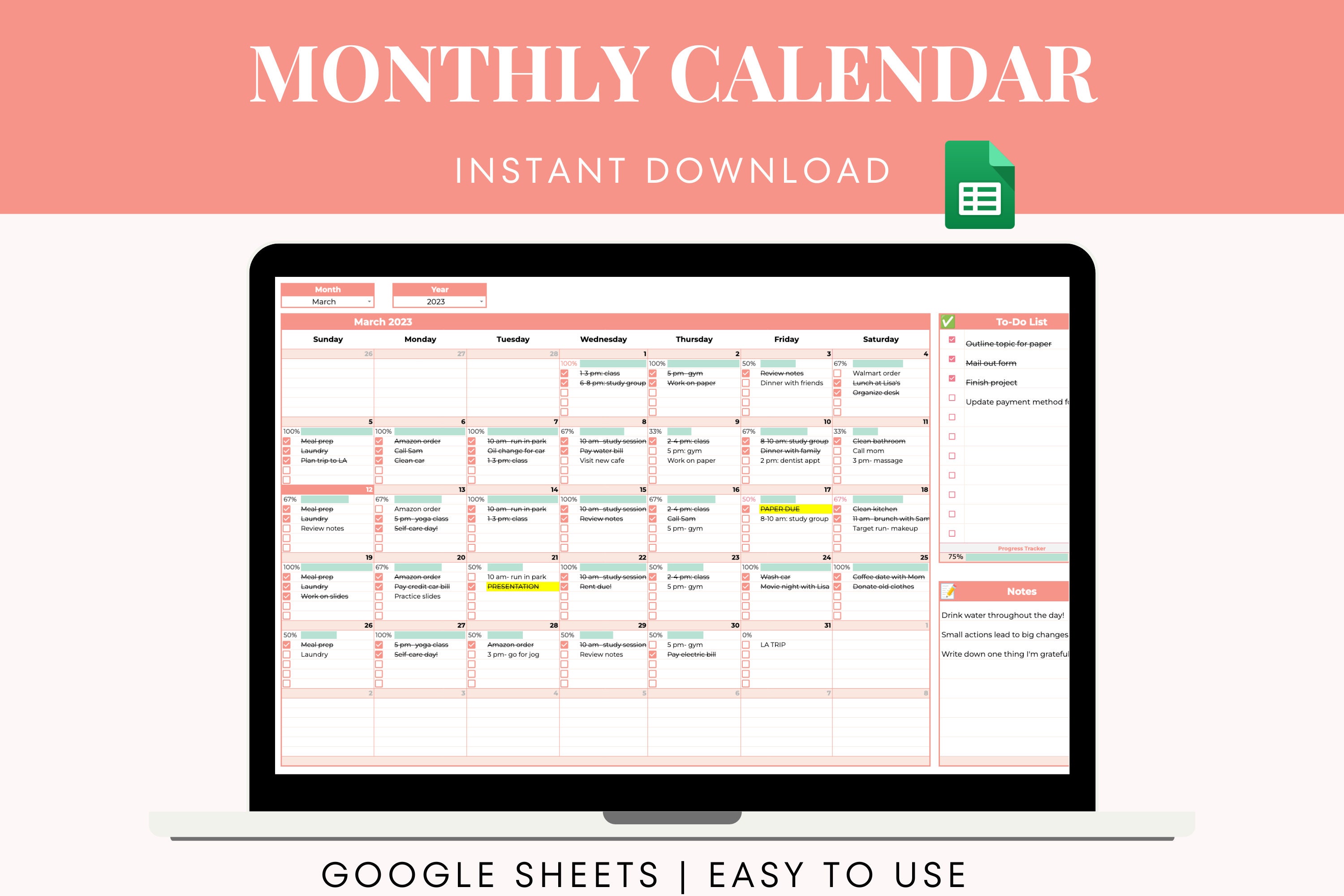Monthly Digital Calendar 2023 Google Sheets To do List Editable Task