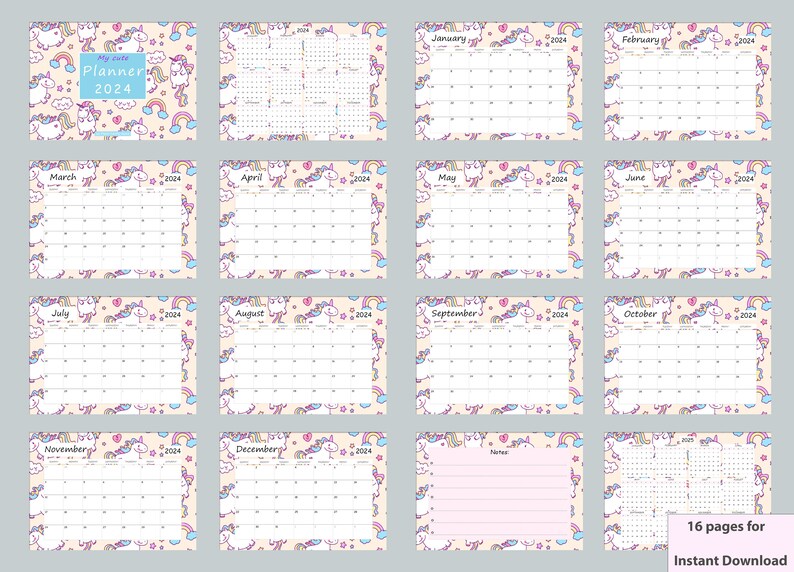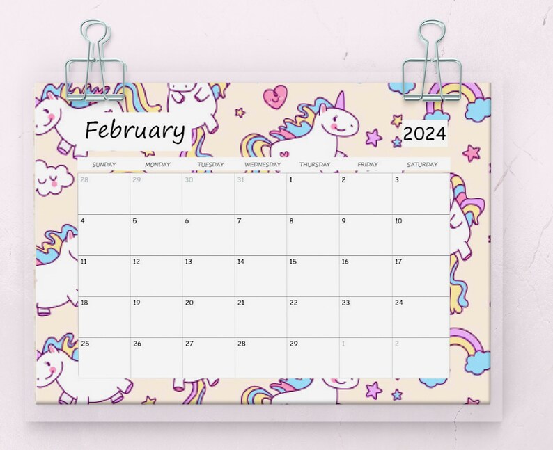 WALL CALENDAR UNICORN 2024 A3 Printable Instant Download Montly Planner