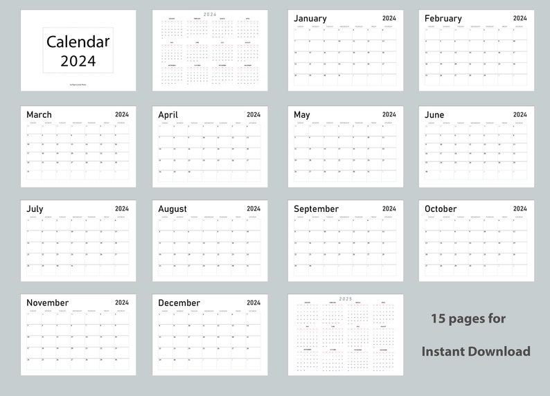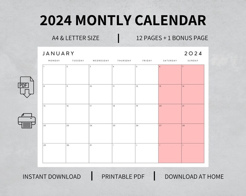 Printable Calendar 2024 Digital Planner 2024 Montly Planner 2024 Plain