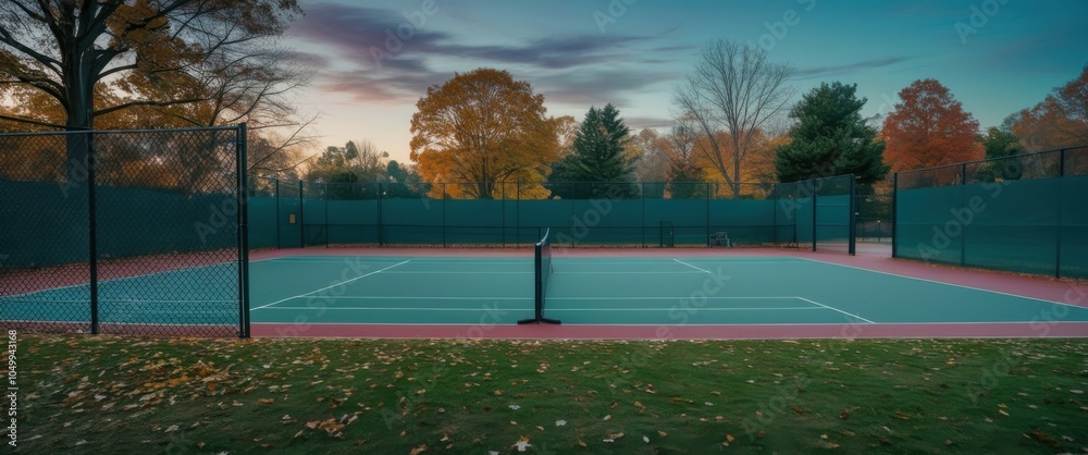 Sunset over tennis courts empty park scene autumn trees cloudy sky