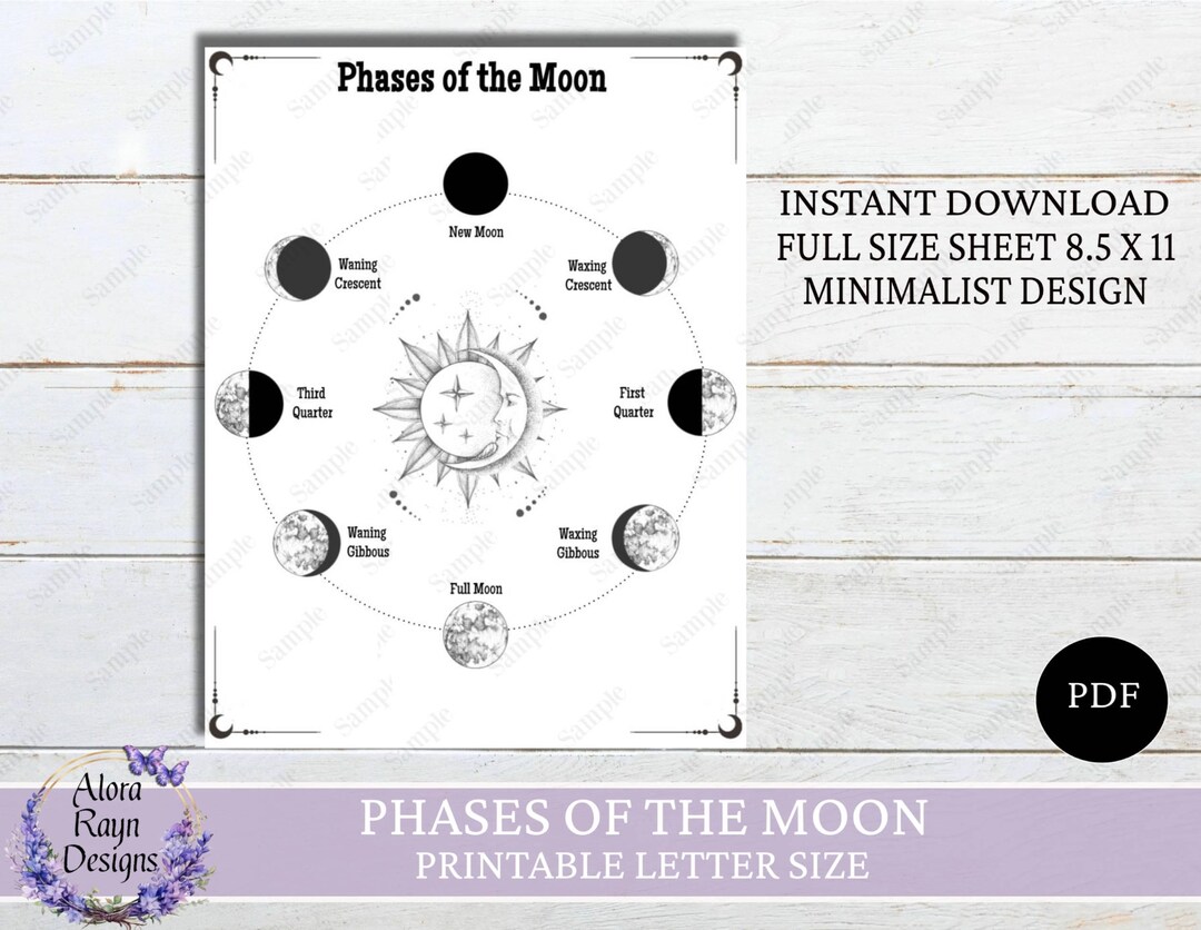 Printable Lunar Phase Chart 8 Phases of the Moon US Letter / A4 Moon