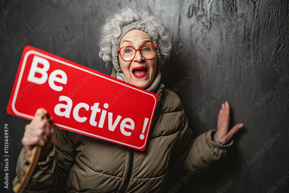 Be active concept image with an old elder active woman and board sign