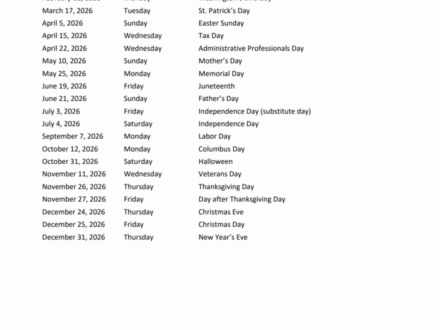 2026 Holiday List Printable StudySheets Free Printable Study Aids