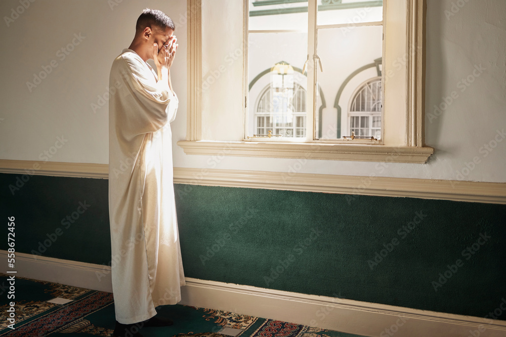 Muslim prayer or man in a mosque praying to Allah for spiritual