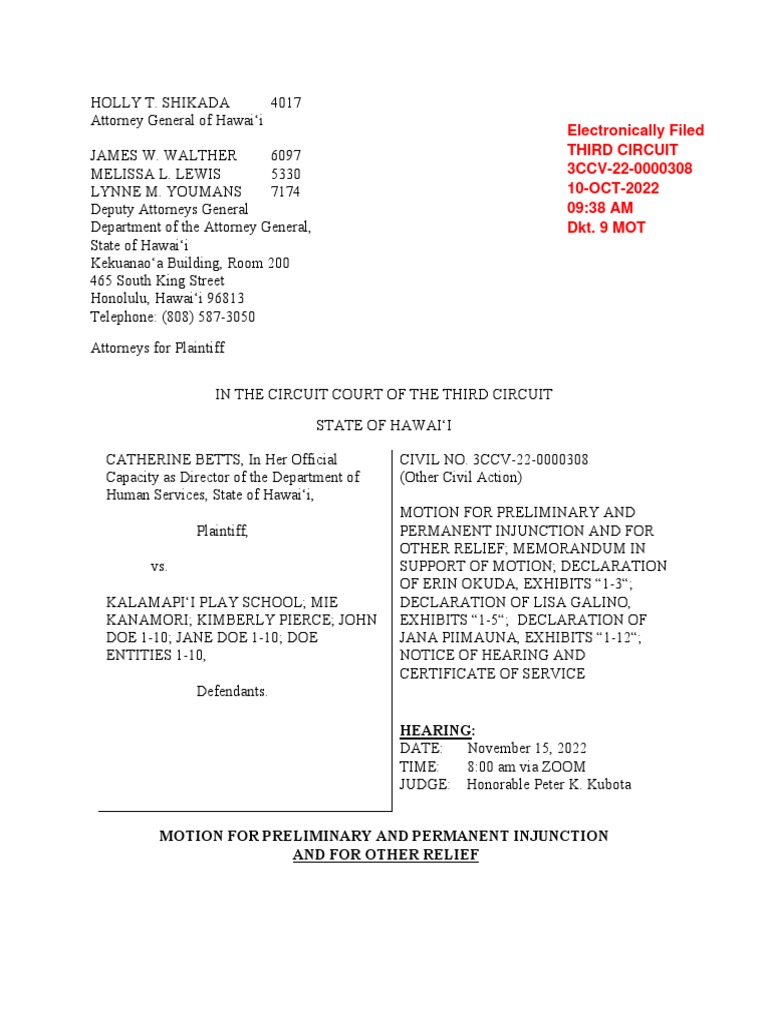 Motion of Preliminary Injunction PDF Injunction Child Care