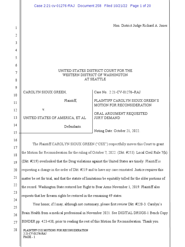 Motion For Reconsideration in The U S DISTRICT COURT Washington State