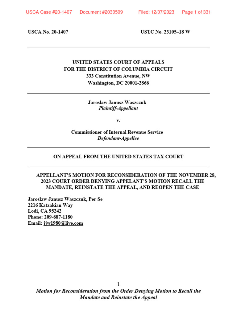 12 07 2023 DC Circuit Motion for Reconsideration From Order Dated 11