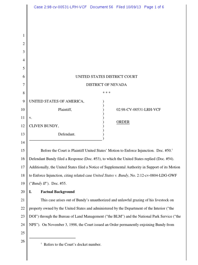 Court Order Granting Motion To Enforce Injunction On Cliven Bundy PDF
