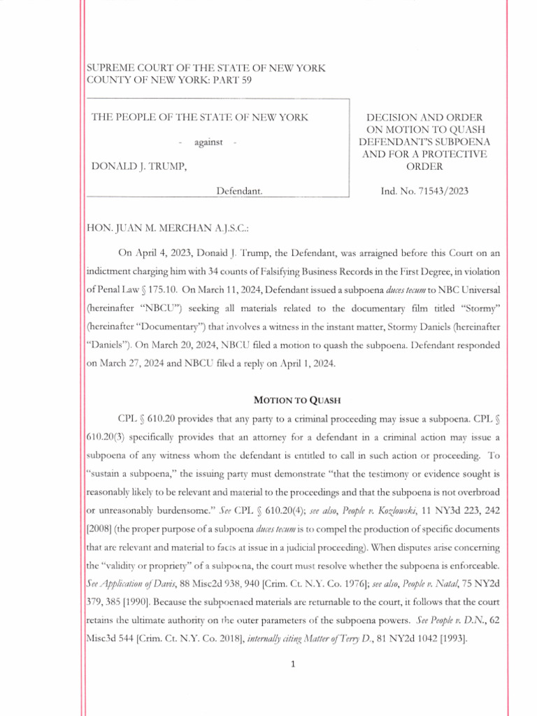 Decision and Order On Motion To Quash Defendant s Subpoena People v