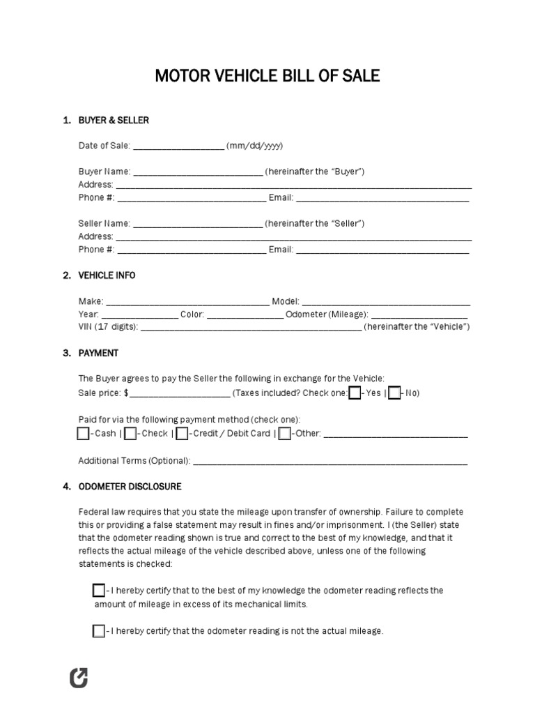 Blank Motor Vehicle Bill Of Sale PDFSimpli