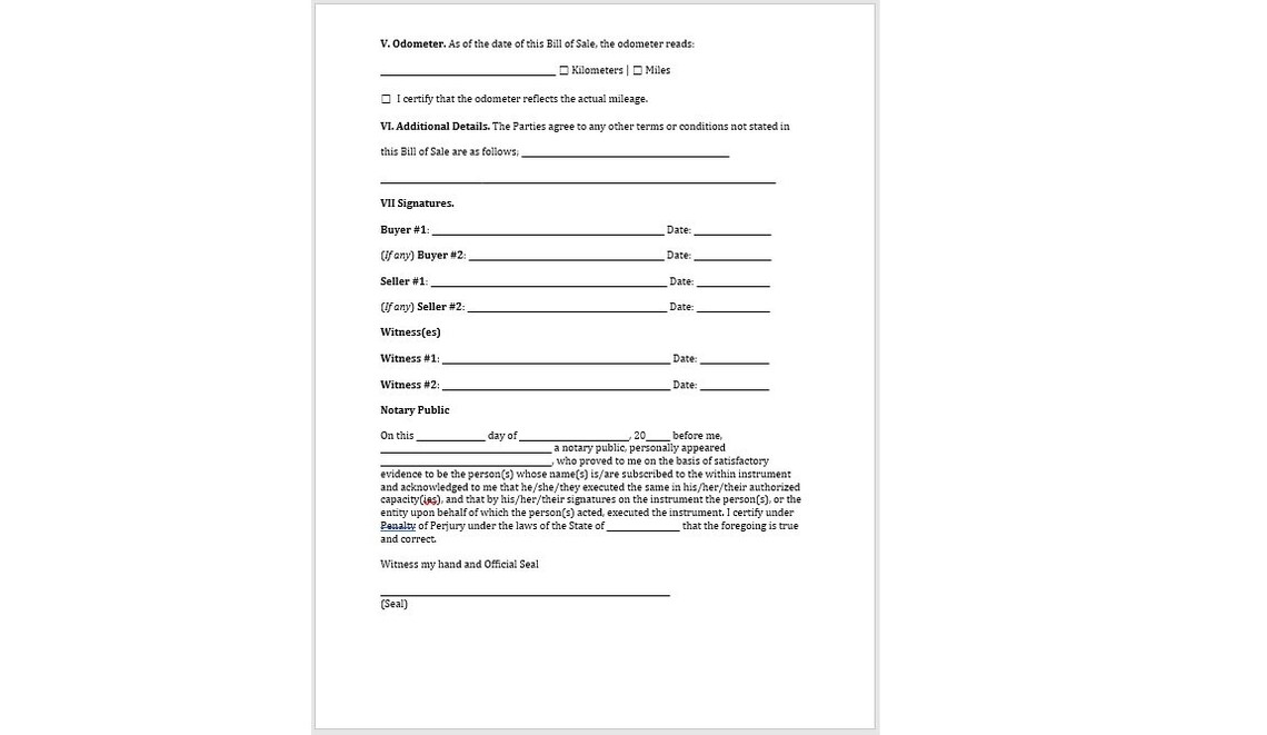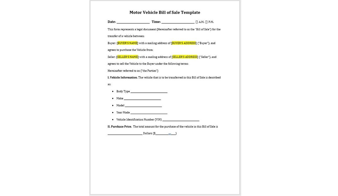 Free Motor Vehicle Bill of Sale Template to Edit Online