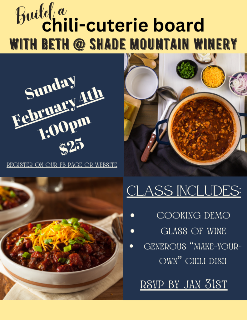 Build a chili cuterie board w/ Beth Stark Shade Mtn Winery Cancelled