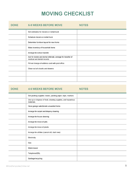 Printable Moving Checklist Templates Word Excel