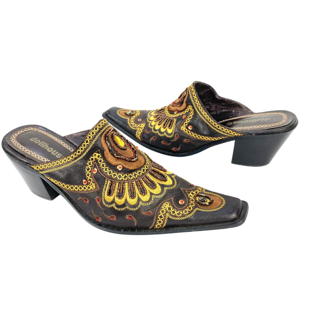 Vintage Western Mules Dark Brown Leather Ankle Shoes with Beading