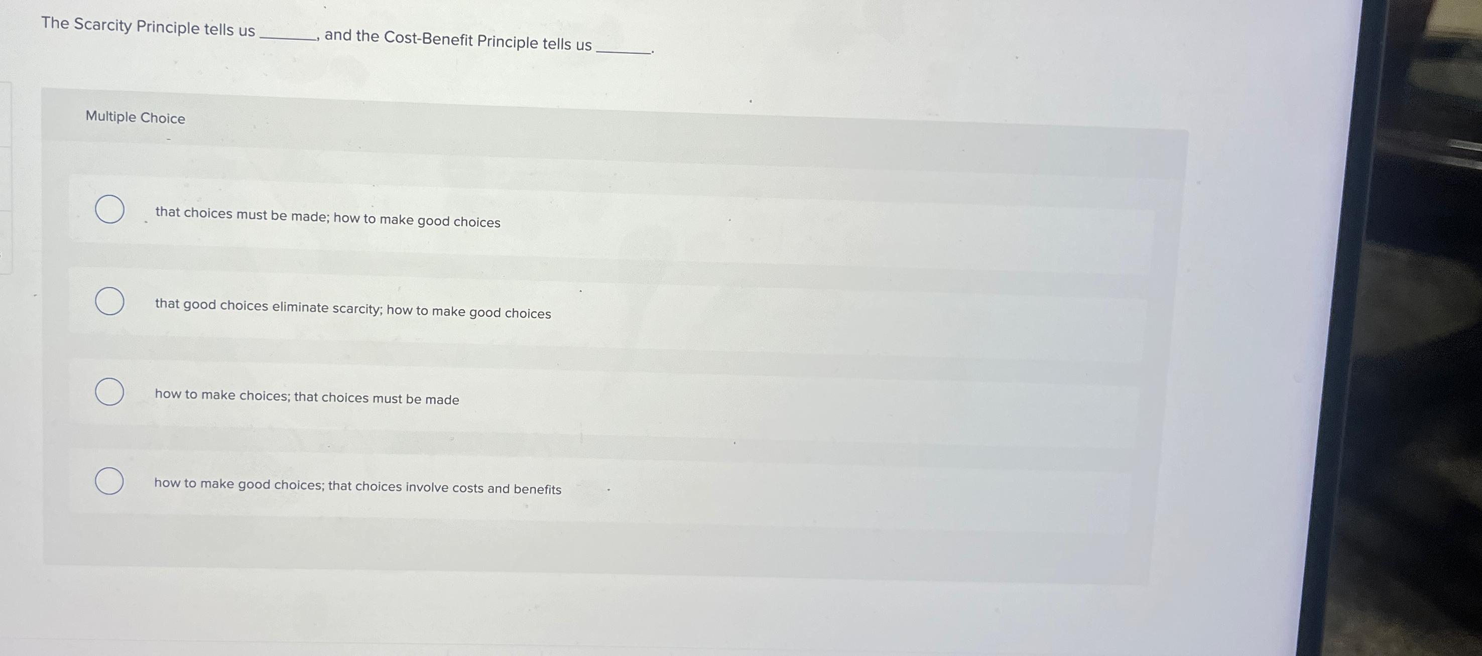 Solved The Scarcity Principle tells us and the Cost Benefit Chegg com