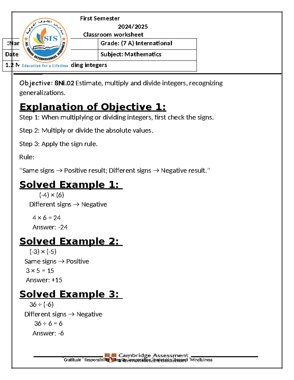 Mathematics Worksheet: Multiplying Dividing Integers (Grade 7A) Studocu