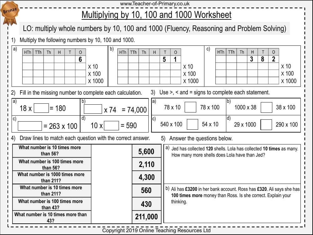 Multiplying By 10 100 And 1000 Worksheet Pdf Printable