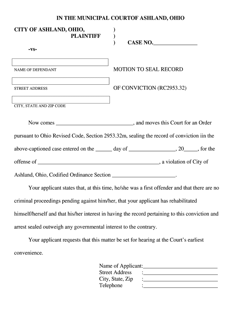 Fillable Online IN THE ASHLAND MUNICIPAL COURT ASHLAND OHIO Fax Email