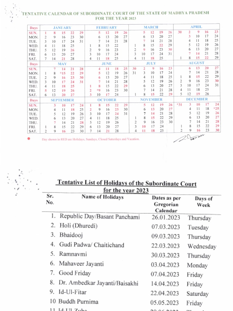 Calendar High Court of Madhya Pradesh