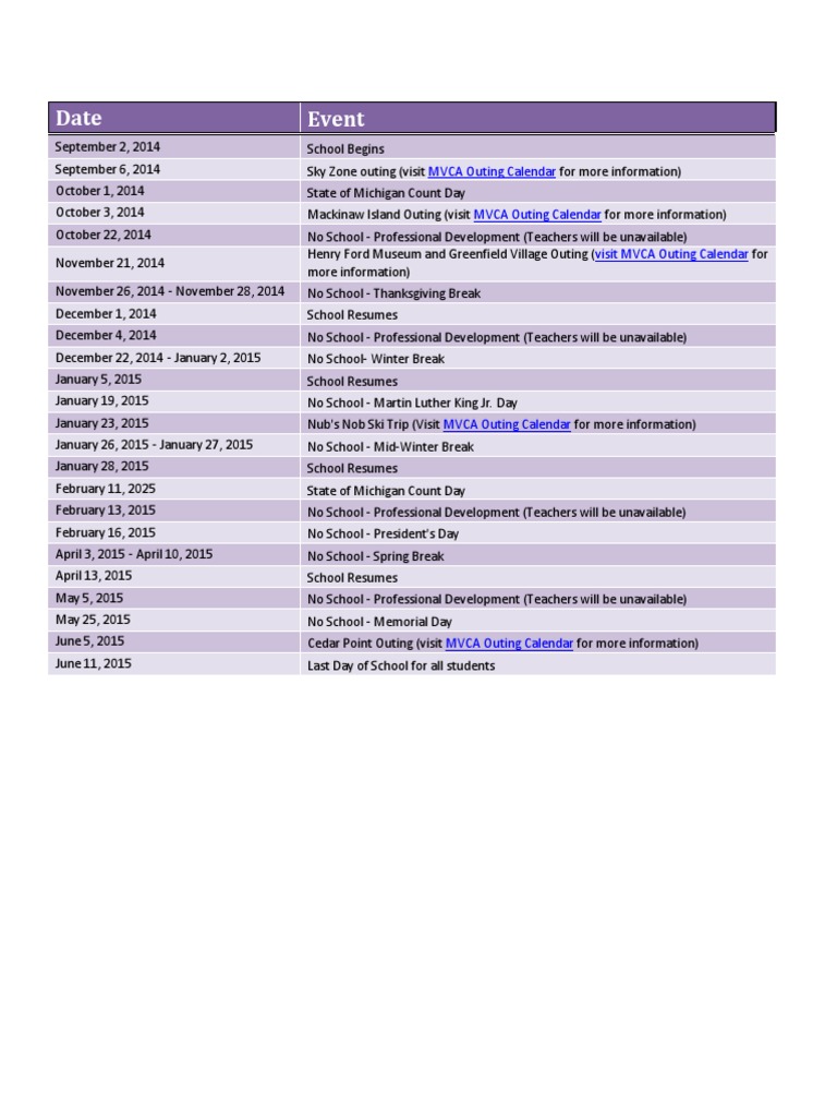 Mvca School Calendar