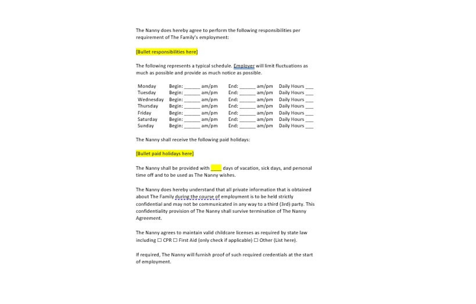 20 Printable Sample Nanny Contract Forms and Templates Fillable
