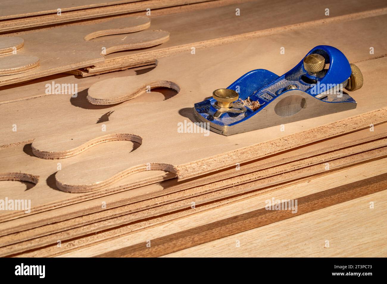 block plane and narrow panels of okoume plywood with puzzle joints from