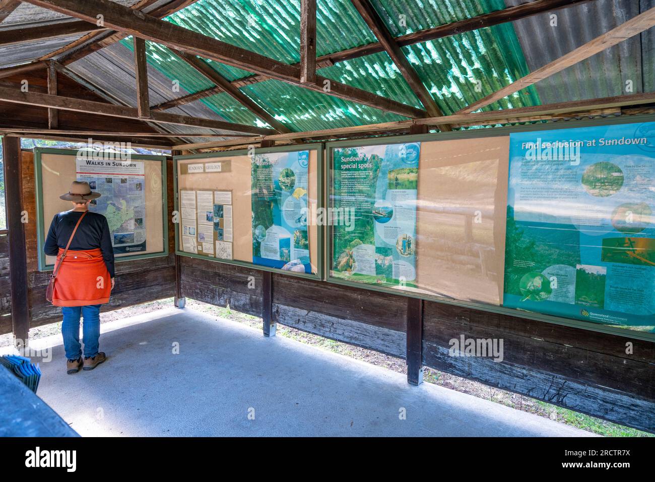 Person looking at information signs at Broadwater Campground Sundown