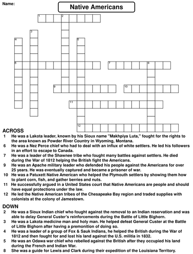 Native Americans Crossword Puzzle Teaching Resources