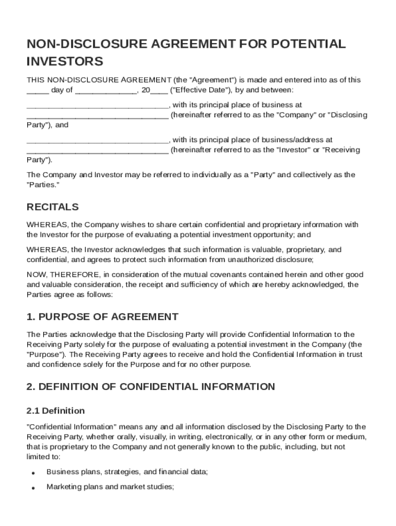 Non Disclosure for Potential Investors Agreement Template: Fill out
