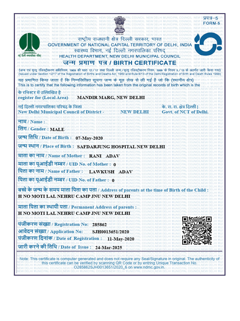 Aaryan NDMC Birth Certificate PDF