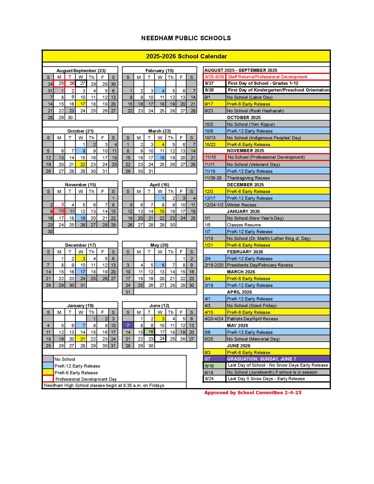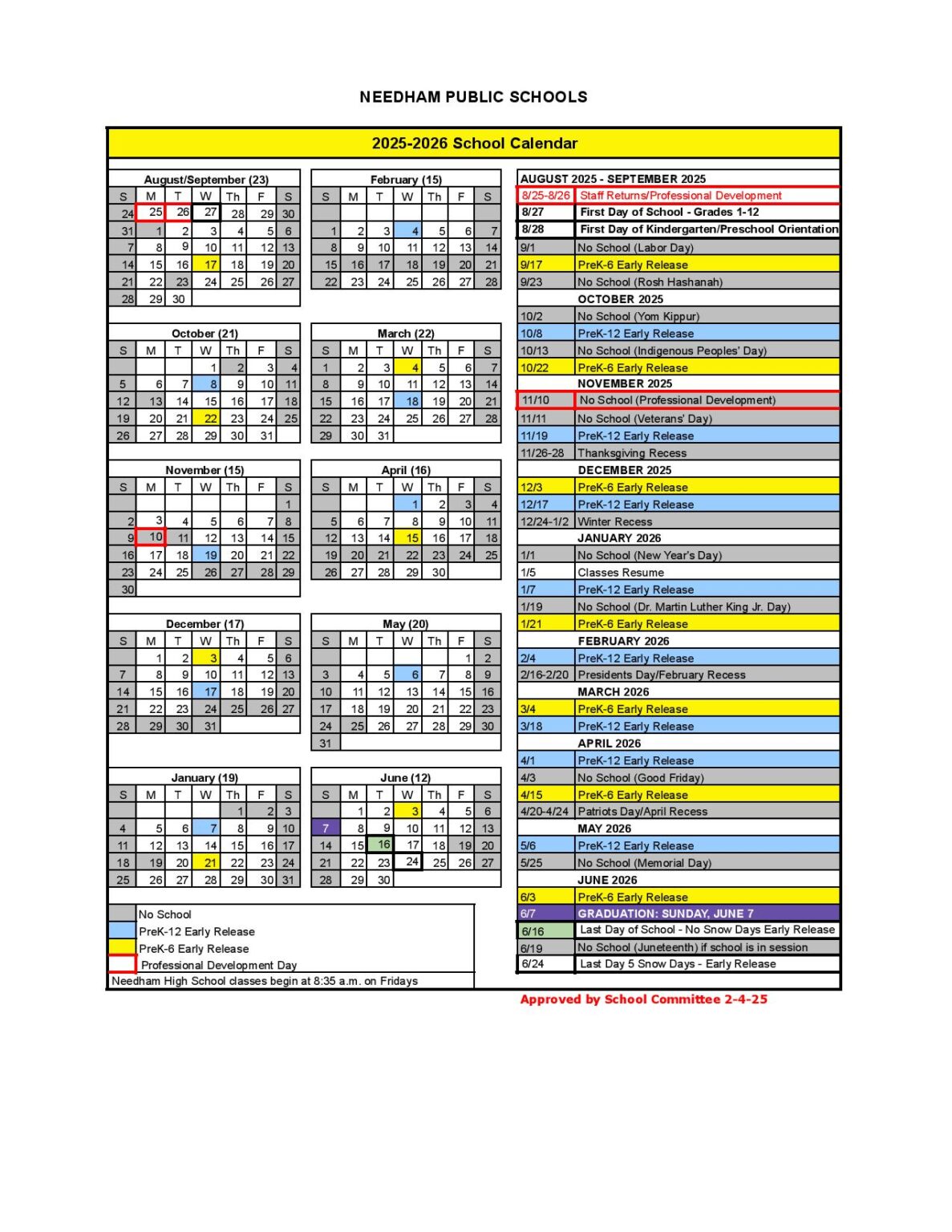 Needham Public Schools Calendar 2025 26 PDF Massachusetts
