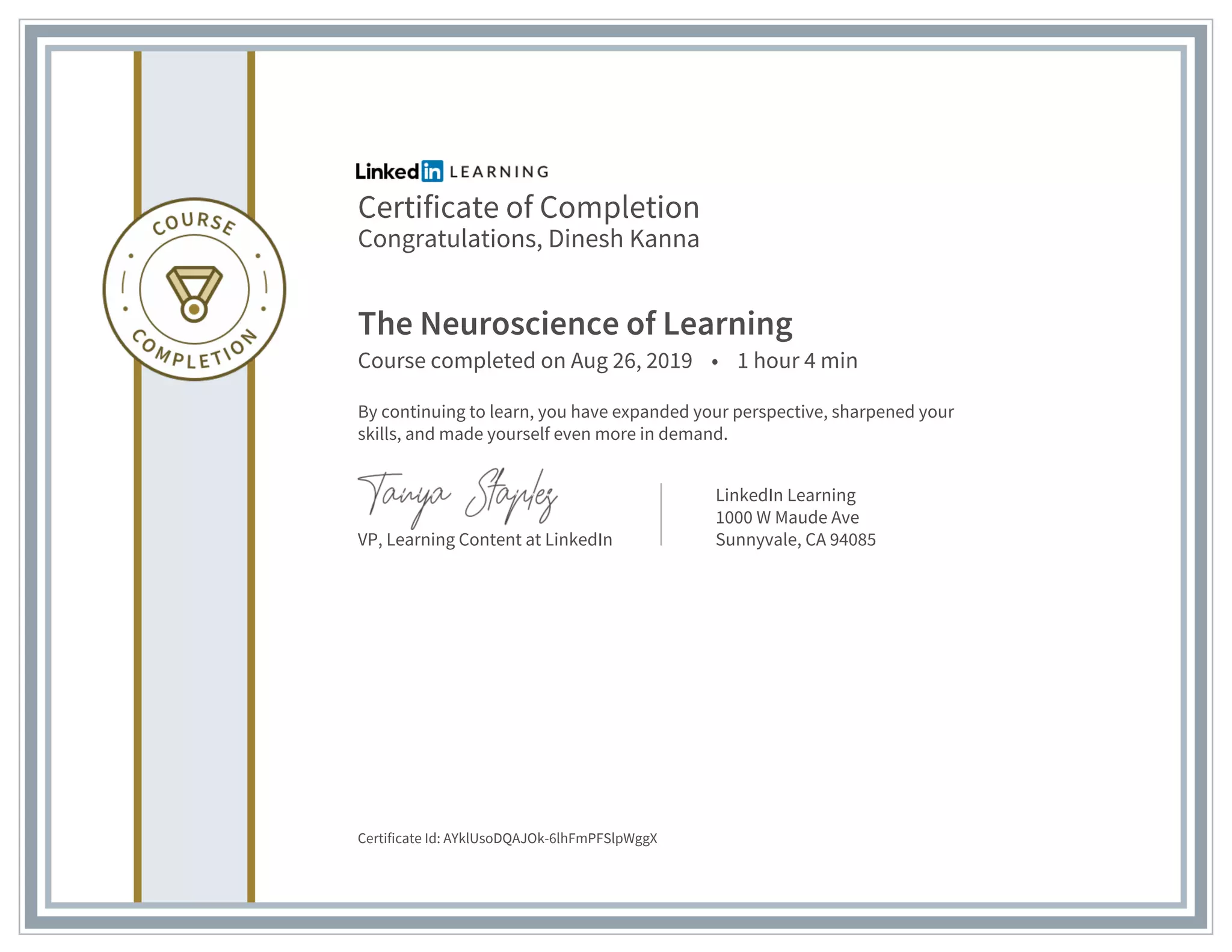 Certificate of completion the neuroscience of learning PPT Free