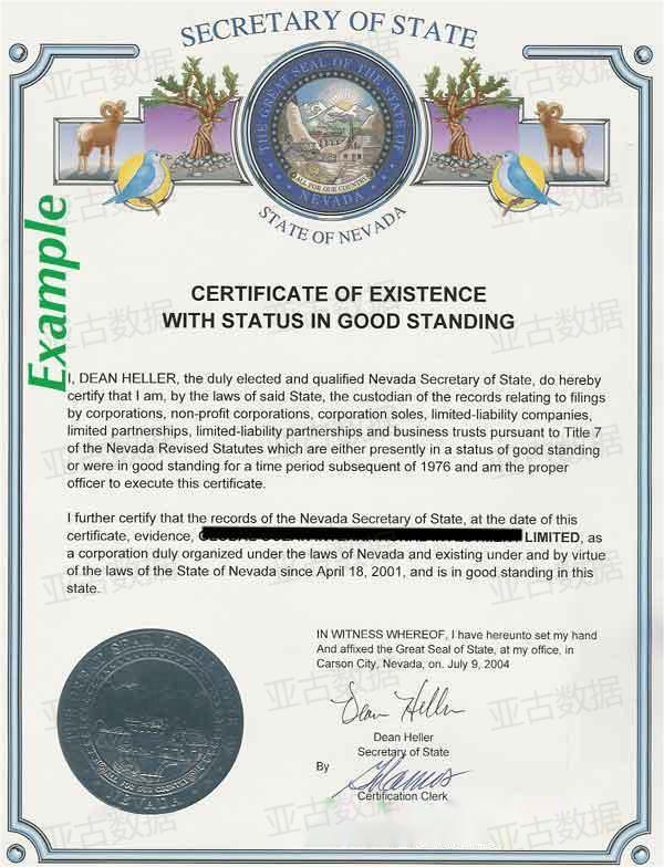 美国内华达州(Nevada)公司Good Standing证书 良好存续证明 亚古数据