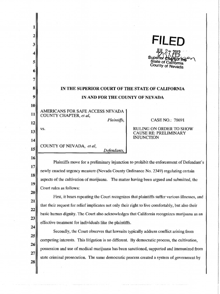 Ruling on Nevada County MMJ Ordinance Federal Preemption Injunction