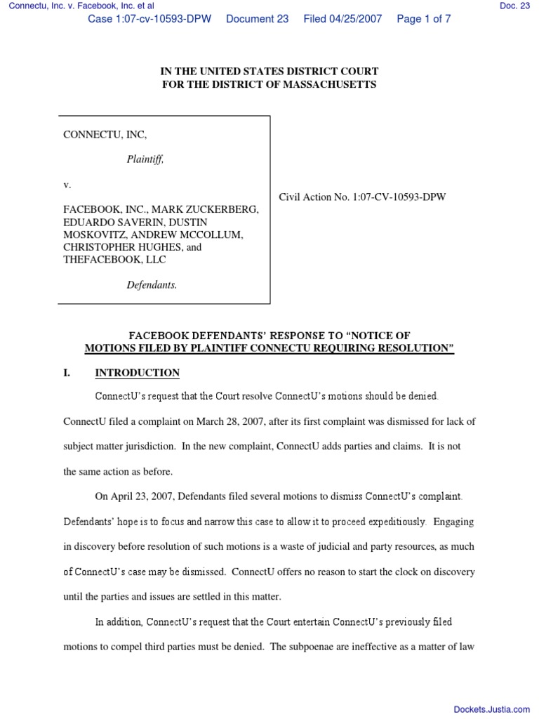 Connectu Inc v Facebook Inc Et Al Document No 23 PDF