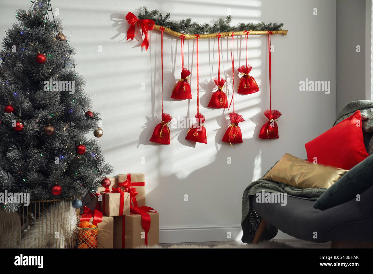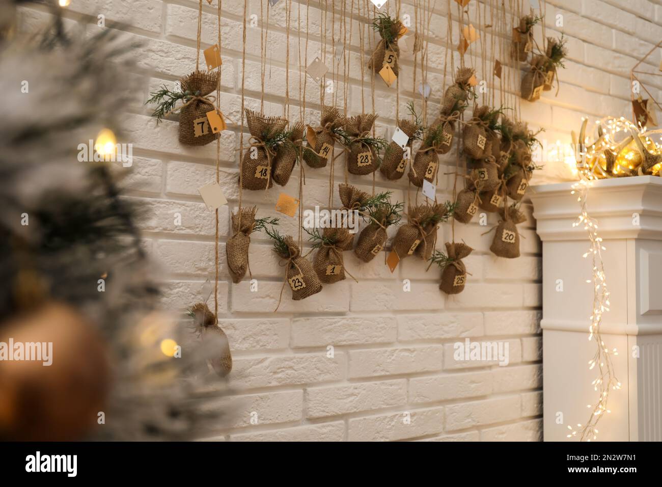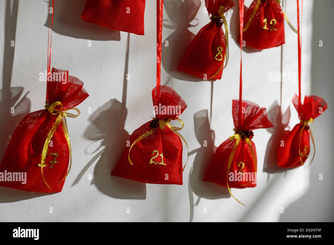 New Year advent calendar hanging on white wall indoors: Stock Photo