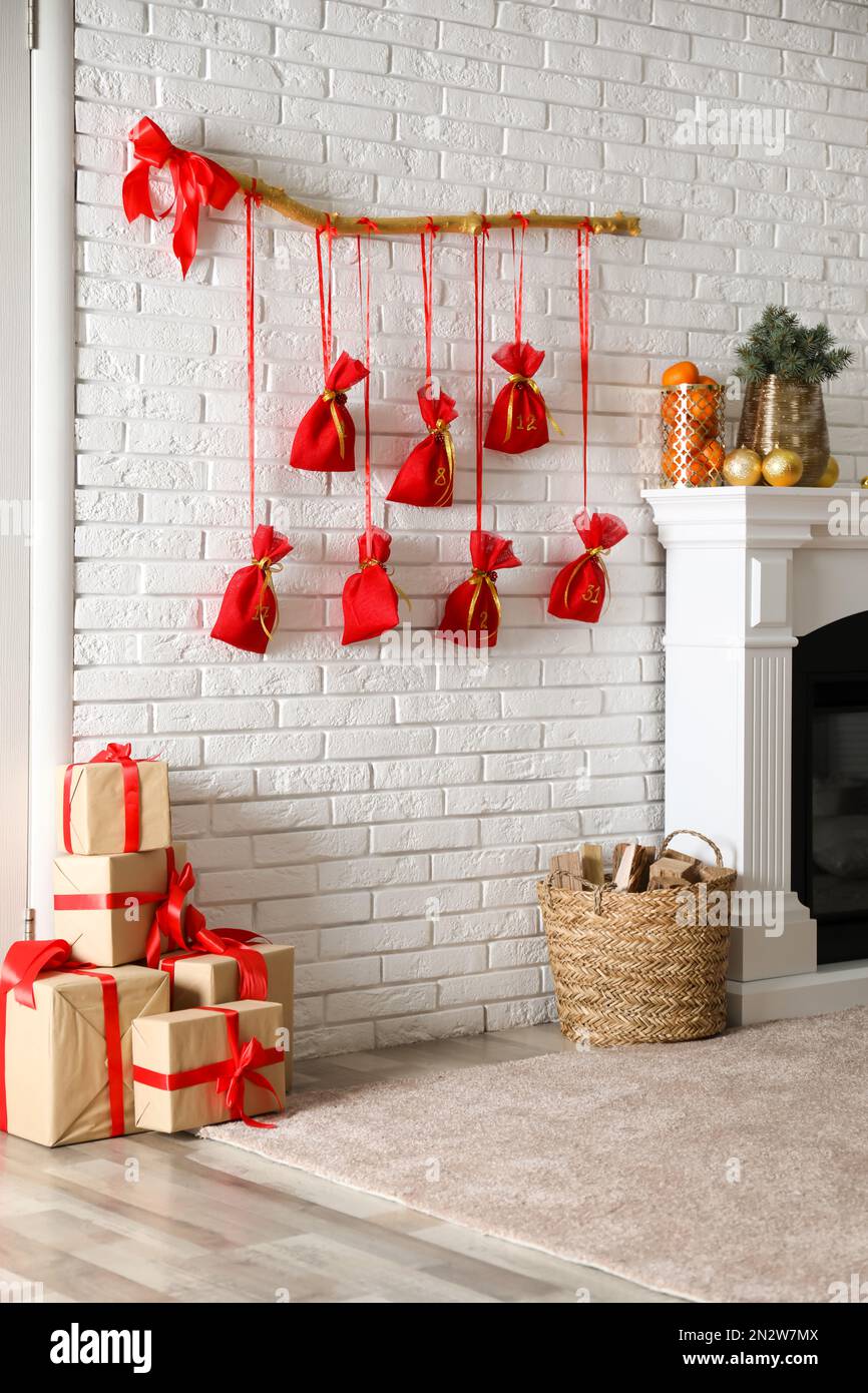 New Year advent calendar hanging on white wall indoors Stock Photo Alamy