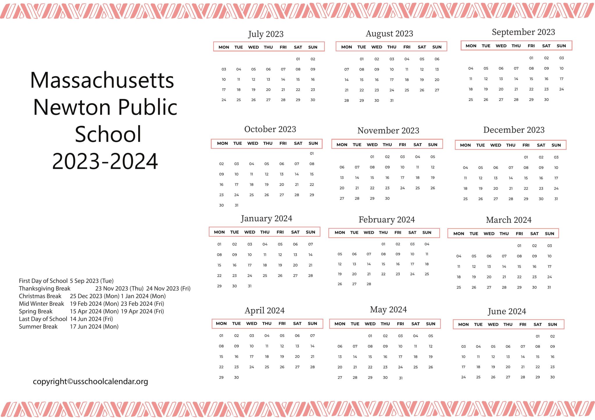 Massachusetts Newton Public Schools Calendar US School Calendar