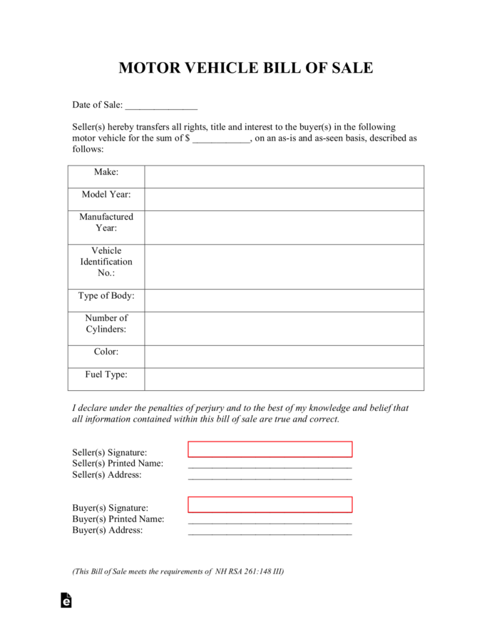 Free New Hampshire Motor Vehicle Bill of Sale Form PDF eForms