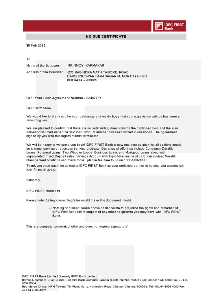 No Due Certificate: IDFC FIRST Bank Limited Registered Office PDF