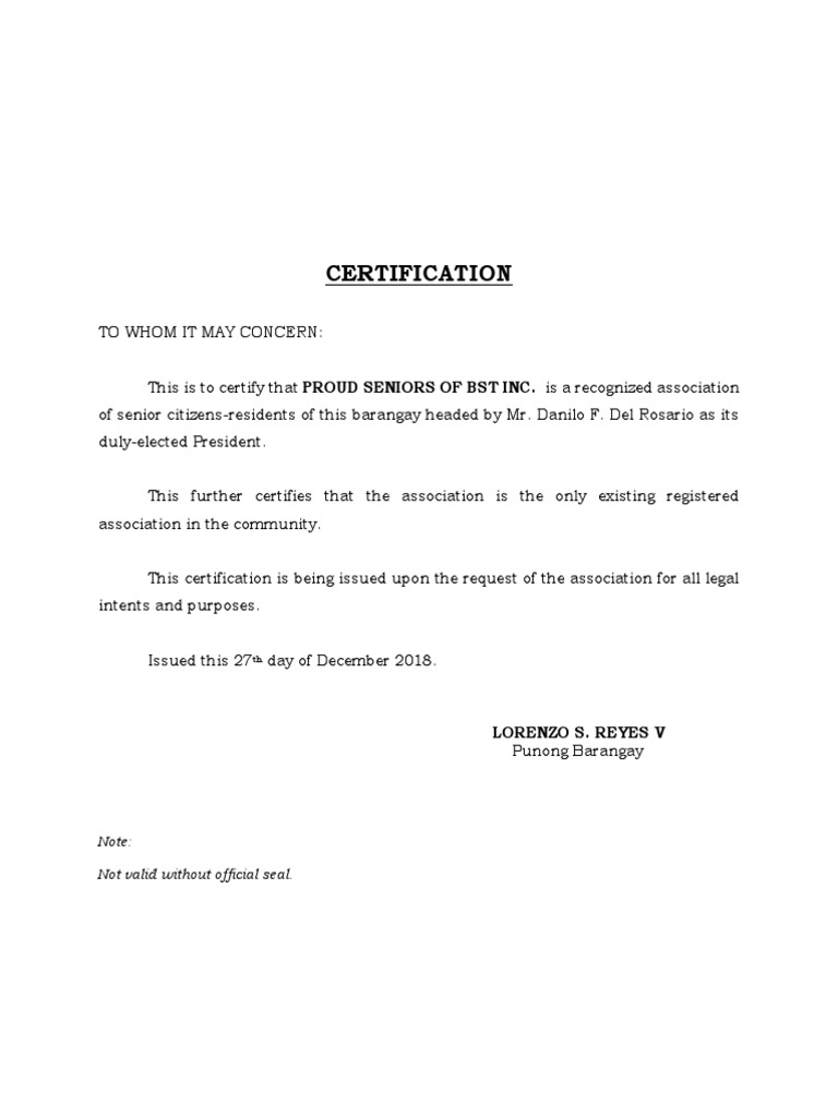 Barangay Certification of No Valid ID (For Deceased Bene) PDF