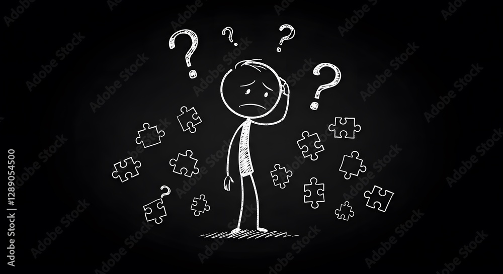 Chalkboard Style Stick Figure Surrounded by Puzzle Pieces and Question