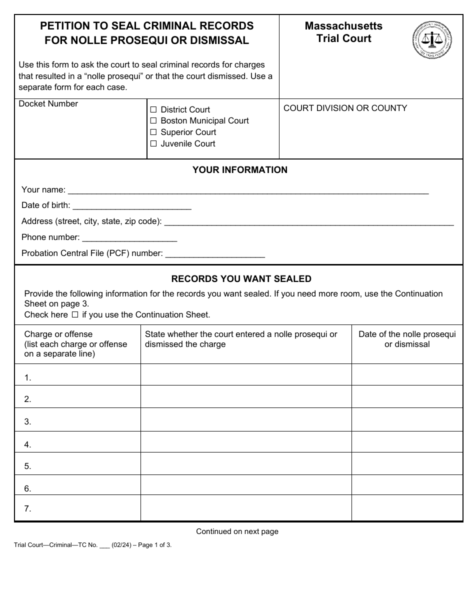Massachusetts Petition to Seal Criminal Records for Nolle Prosequi or