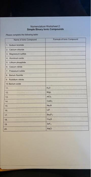 Solved: Nomenclature Worksheet 2: Simple Binary Ionic Compounds 20