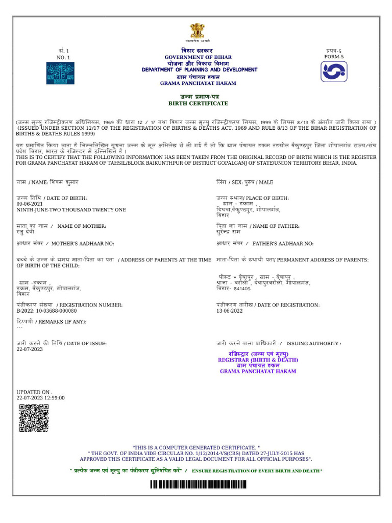 Birth Certificate Bihar PDF