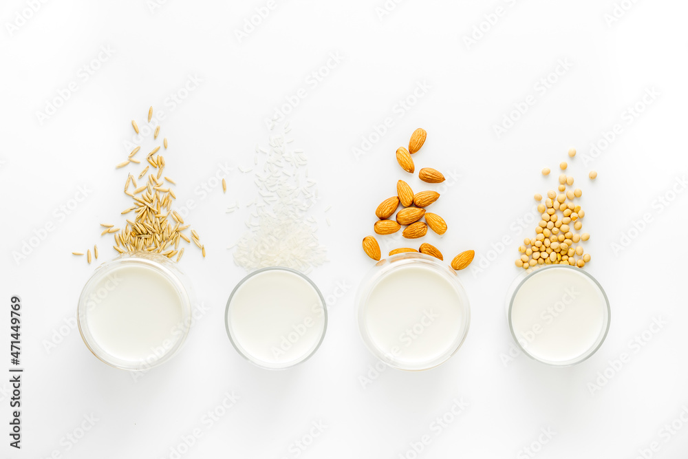 Variety of non dairy vegan milk with ingredients almonds soy rice and