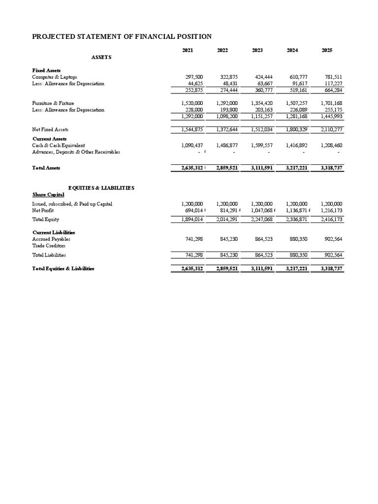Projected Statement of Financial Position PDF Expense Depreciation