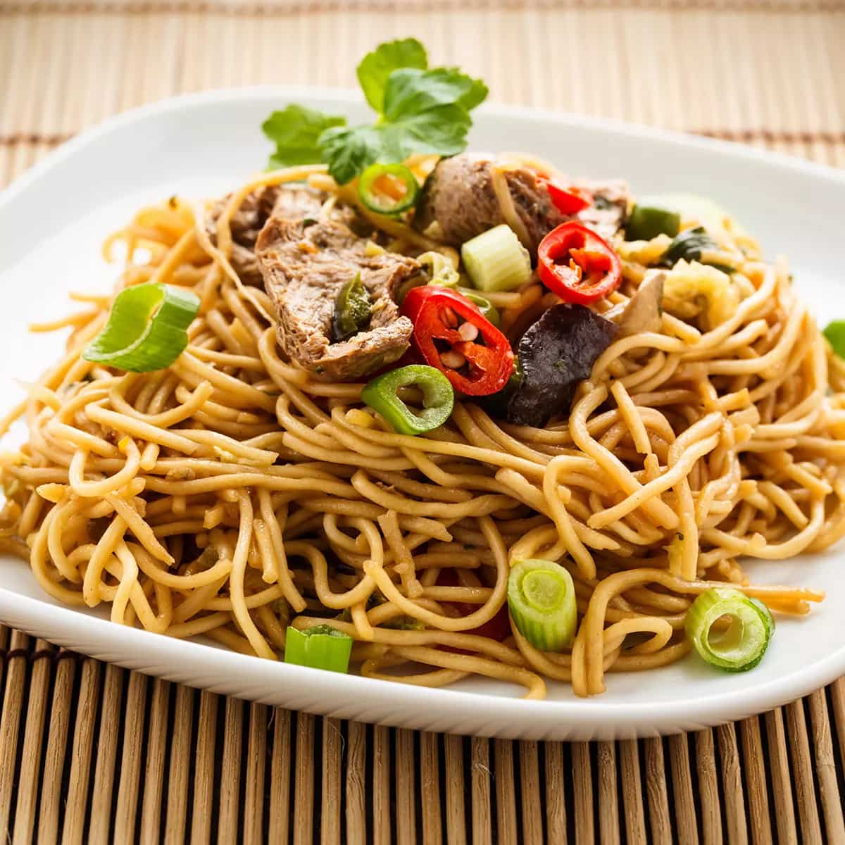 Authentic Steer Fried from Chow Mein Noodles with Vegetables Close up