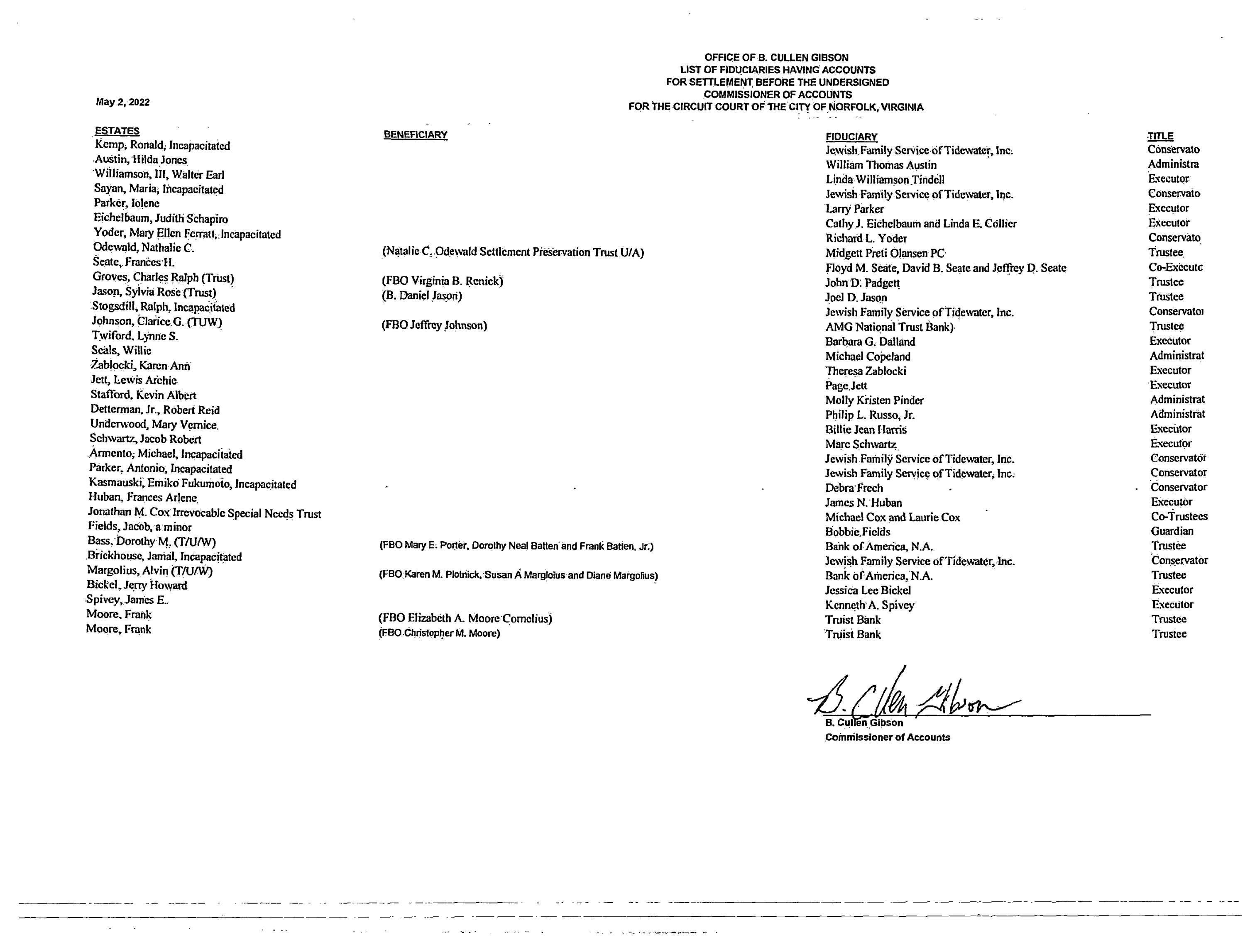 B CULLEN GIBSON COMMISSIONER OF ACCOUNTS/FIDUCIARY LIST by Norfolk