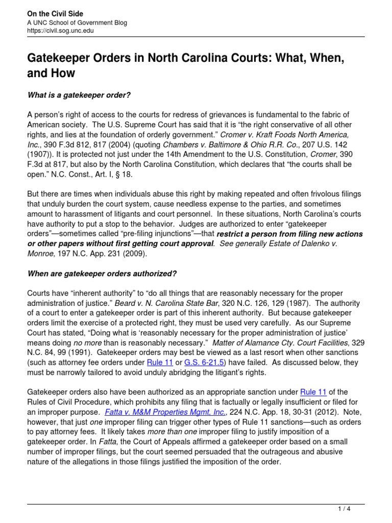 Gatekeeper Orders in North Carolina Courts What When and How PDF PDF